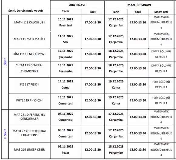 Fen Fakültesi tarafından yürütülen "Temel Bilim Dersleri" mazeret sınavları 17-19 Aralık